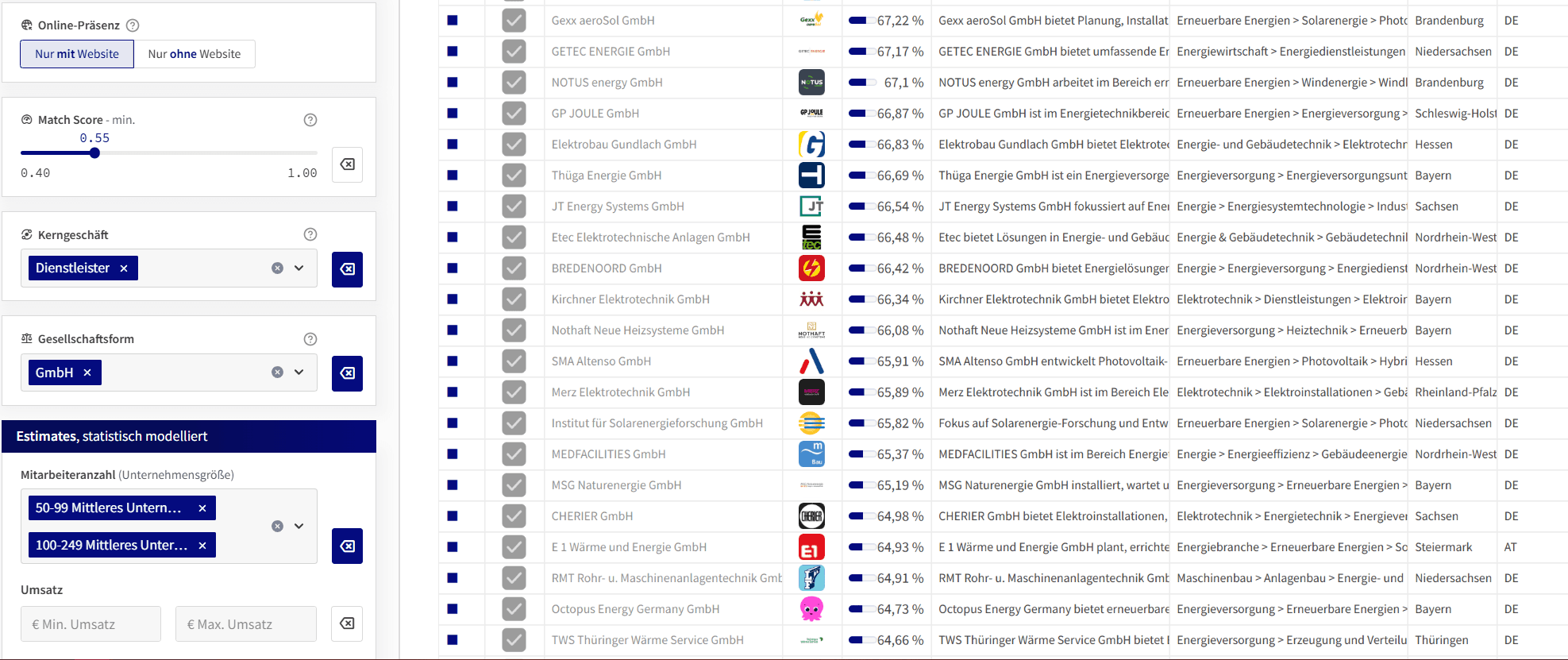 Schritt 1: Zielsegment definieren. Der Makler legt seine Filterkriterien fest, zum Beispiel „IT-Unternehmen, 10 bis 100 Mitarbeitende, Bayern und Baden-Württemberg, GmbH-Rechtsform". Das dauert wenige Minuten.
