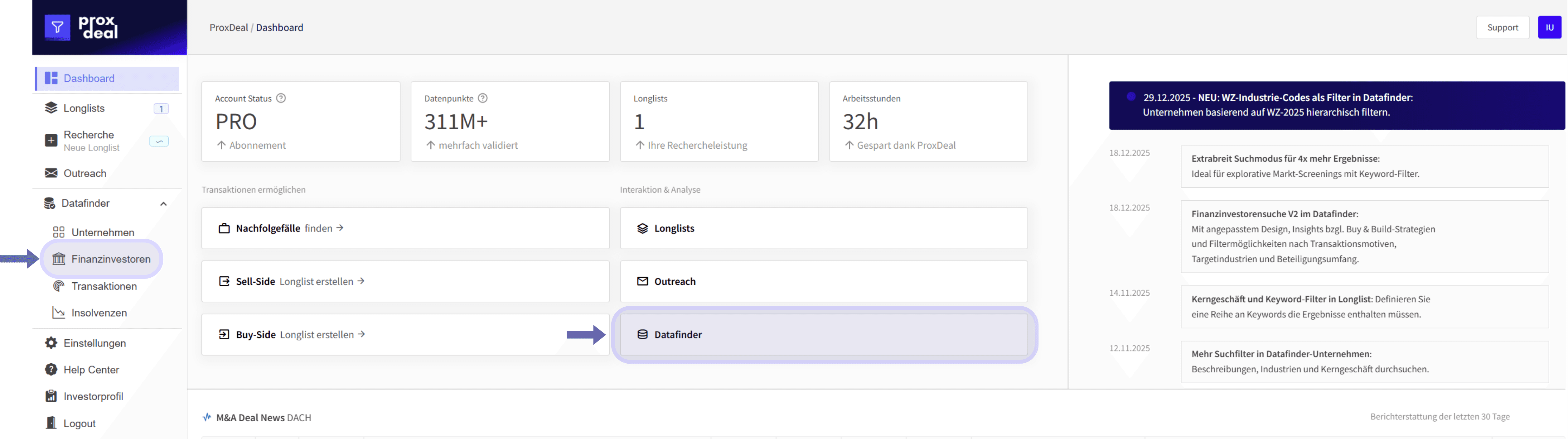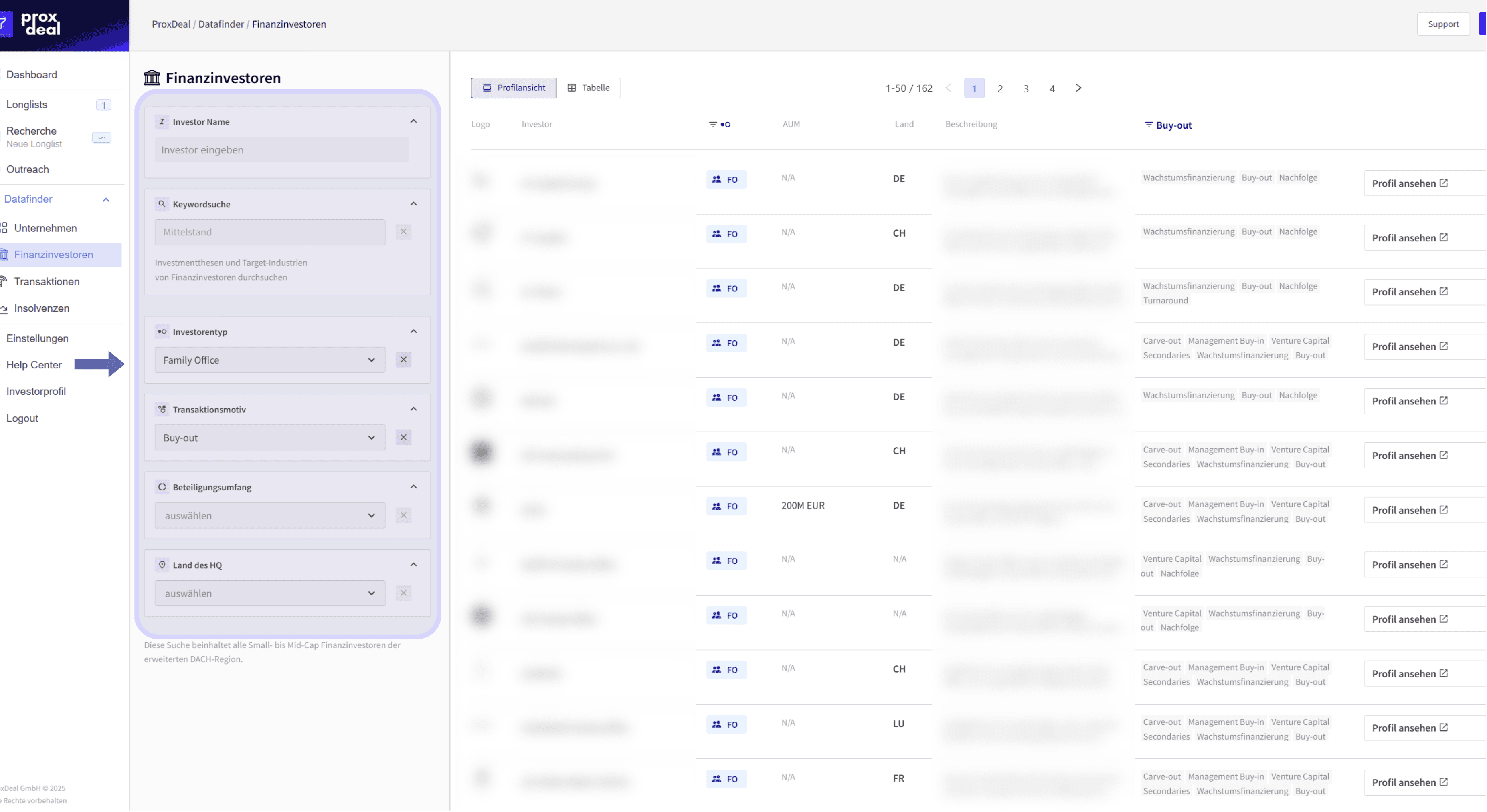 Die Finanzinvestoren-Suche ist im Datafinder integriert und kann direkt im Dashboard oder über die linke Seitenleiste gestartet werden.