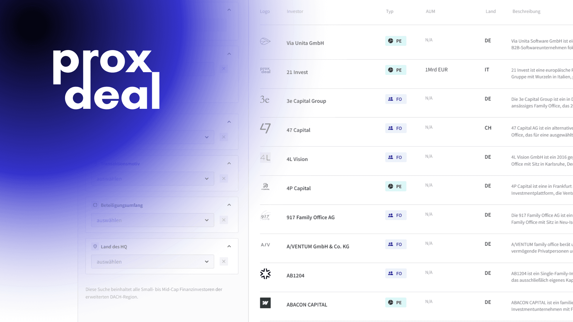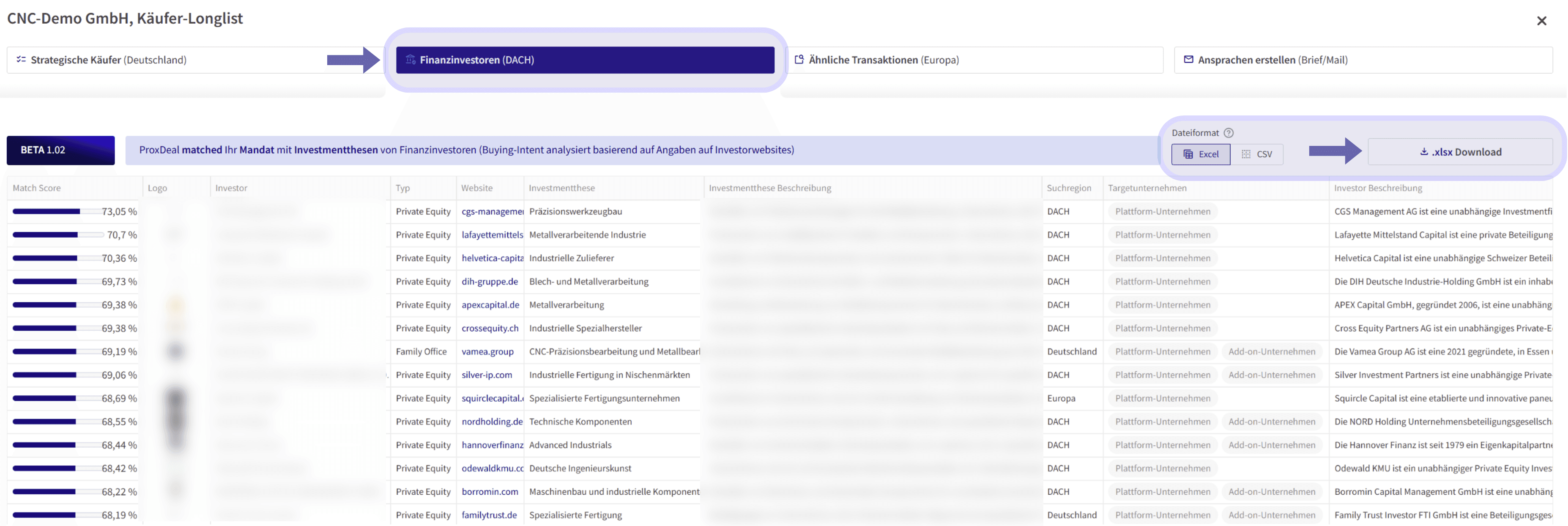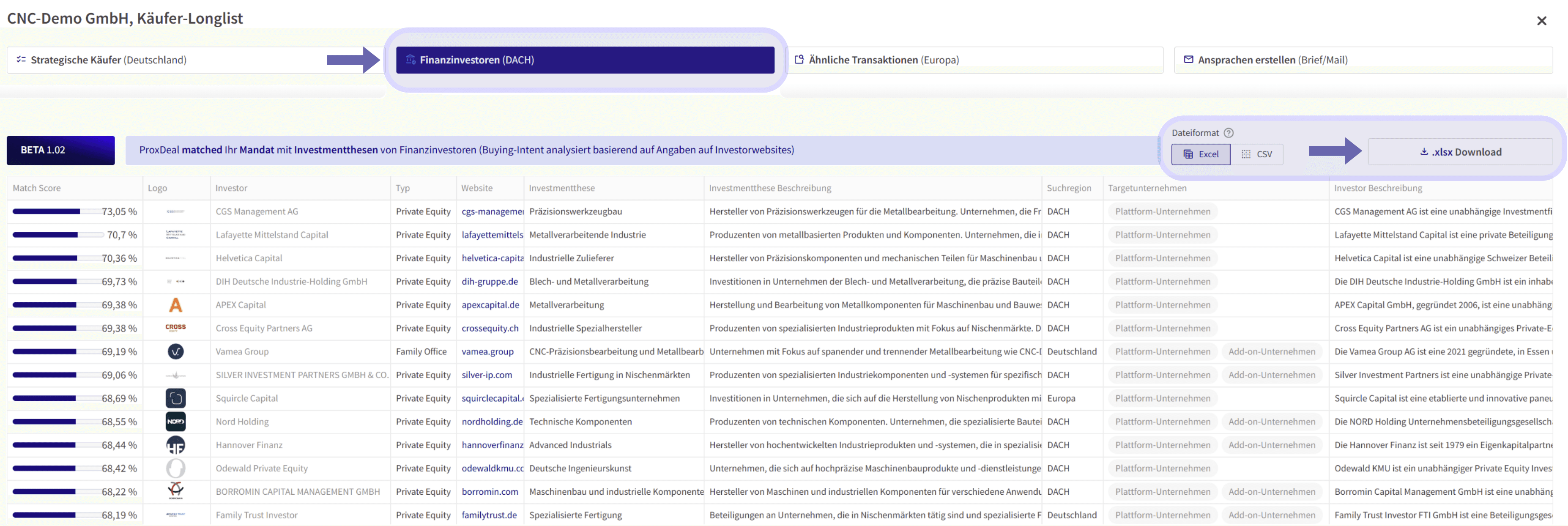 Finanzinvestoren werden zusätzlich bei Sell-Side Suchen als eigener Tab „Finanzinvestoren (DACH)“ in der Longlist ausgegeben . ProxDeal matched dabei die Kurzbeschreibung der durchgeführten Sell-Side-Suche mit Investmentthesen von Finanzinvestoren und sortiert die Ergebnisse nach Match-Score.