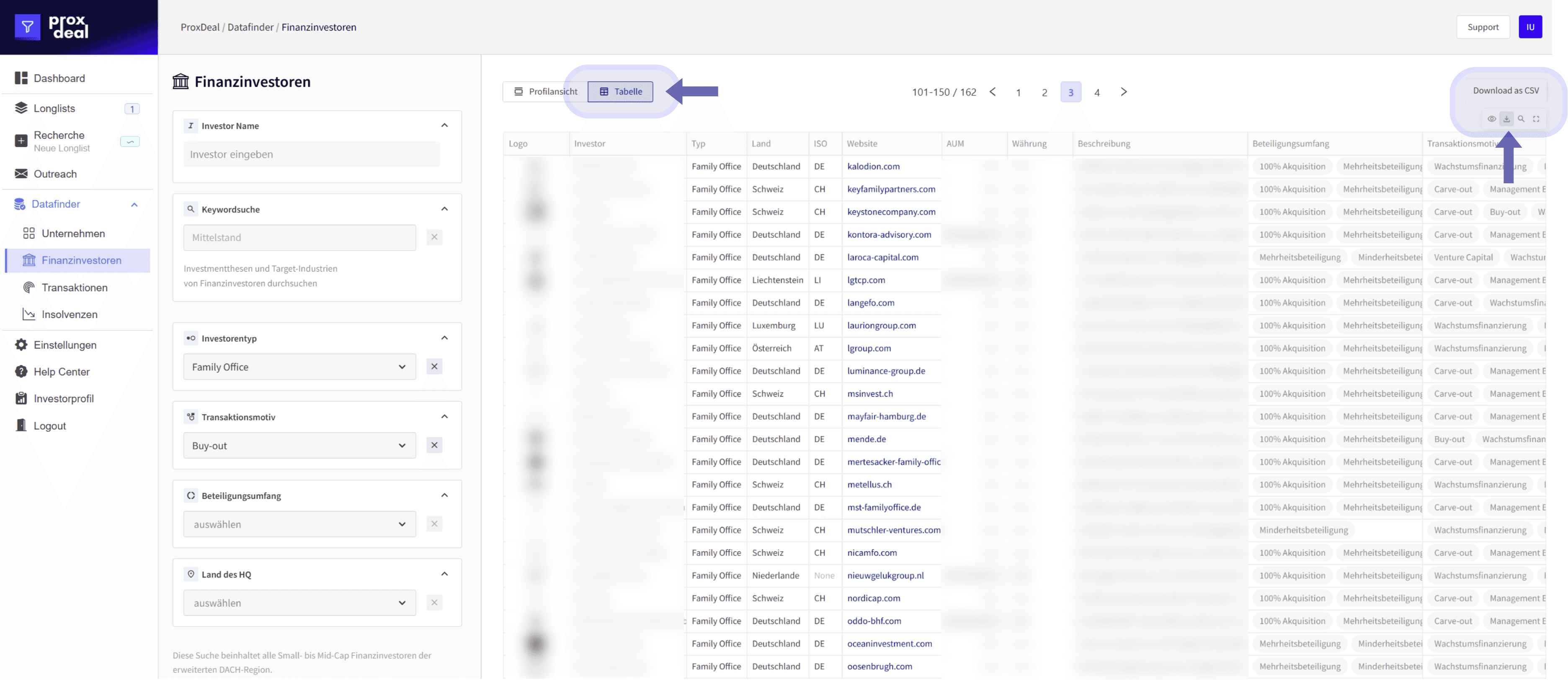 In der Tabellenansicht werden die Ergebnisse in einer vergleichbaren Struktur dargestellt (u. a. Investor, Typ, Land, Website, AUM/Währung, Beschreibung, Beteiligungsumfang und Transaktionsmotive). Je nach Kontext lässt sich die Tabelle anschließend als CSV exportieren um sie weiterzuverarbeiten.