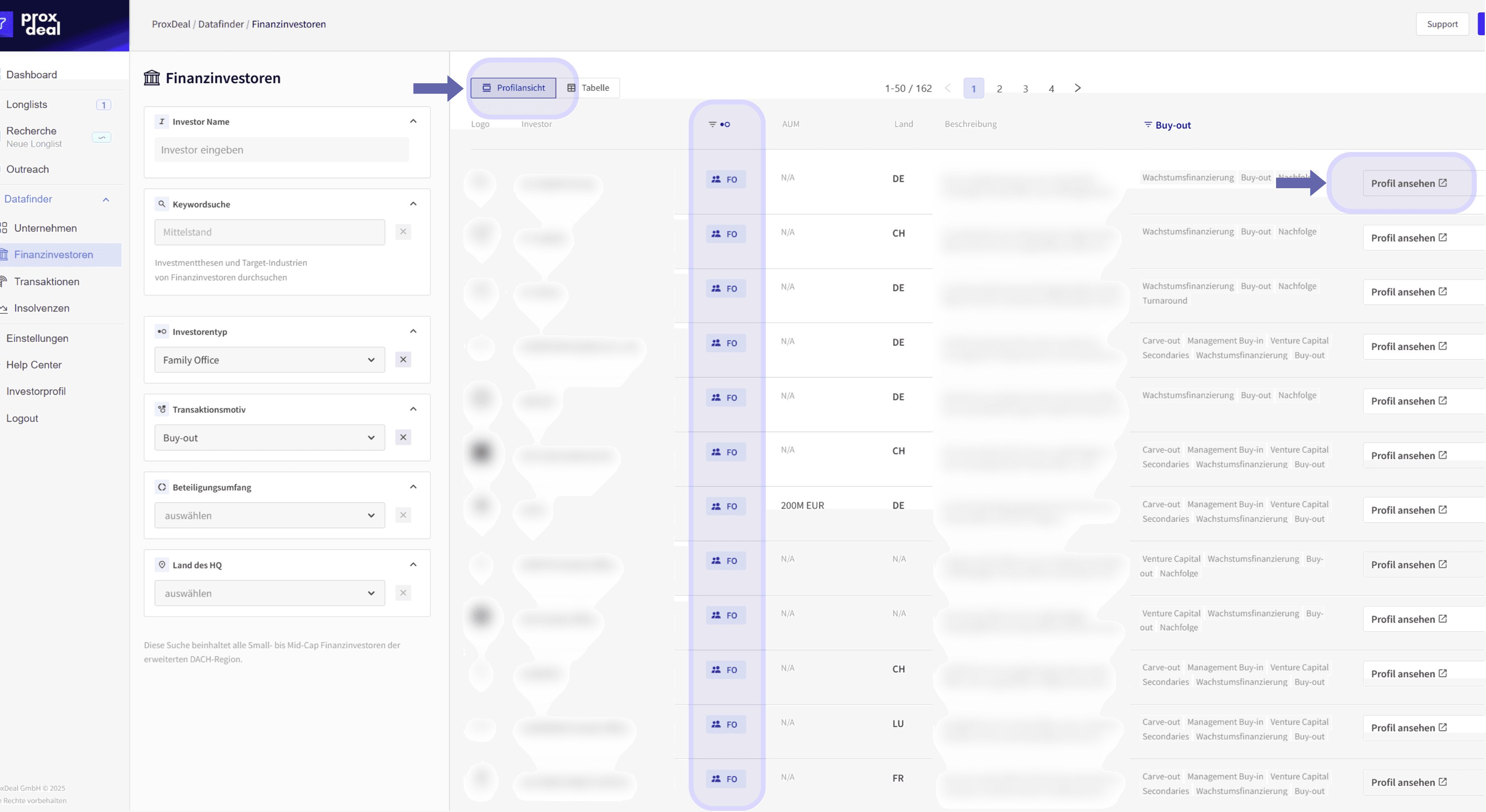 In der Profilansicht werden Investoren als Ergebnisliste ausgegeben, inklusive Typ (z. B. PE/FO), Land, kurzer Beschreibung sowie Transaktionsmotiven als Tags. Mit einem Klick auf „Profil ansehen“ öffnet sich die Detailansicht des jeweiligen Investors.