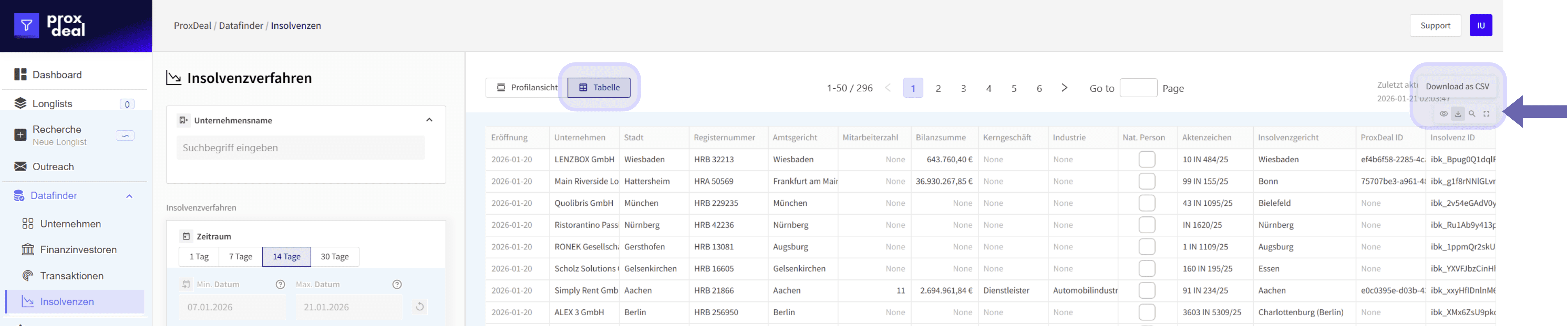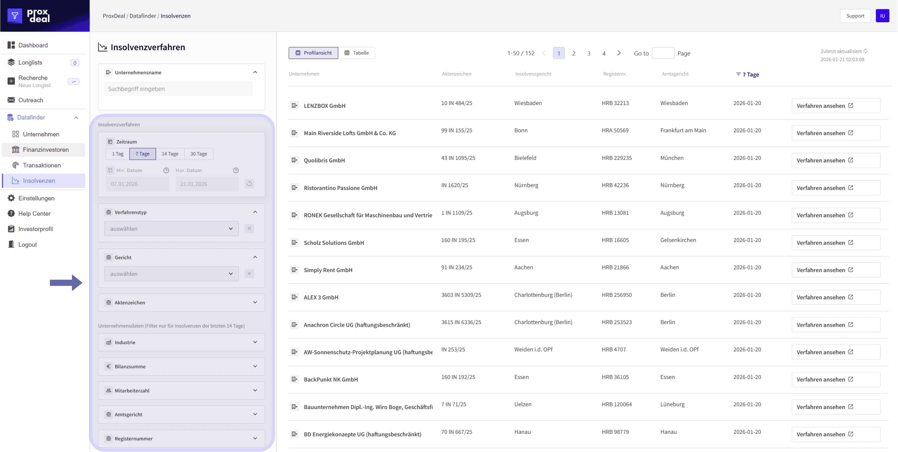 Mit der Insolvenzsuche im Datafinder lassen sich schnell und zuverlässig alle relevanten Insolvenzfälle identifizieren. Nutzer profitieren von umfangreichen Filtermöglichkeiten, die eine gezielte Recherche nach Zeitraum, Verfahrenstyp, Schuldnerart, Bilanzkennzahlen oder Gericht erlauben. Die Darstellung sowohl als Profilansicht als auch in tabellarischer Form mit CSV-Export ermöglicht eine einfache Weiterverarbeitung der Daten. Dank Echtzeitdaten aus dem Insolvenzregister sind die Informationen stets aktuell. So können Investoren, Geschäftspartner und Rechtsanwender fundierte Entscheidungen treffen, Risiken besser einschätzen und zeitnah auf neue Entwicklungen reagieren.