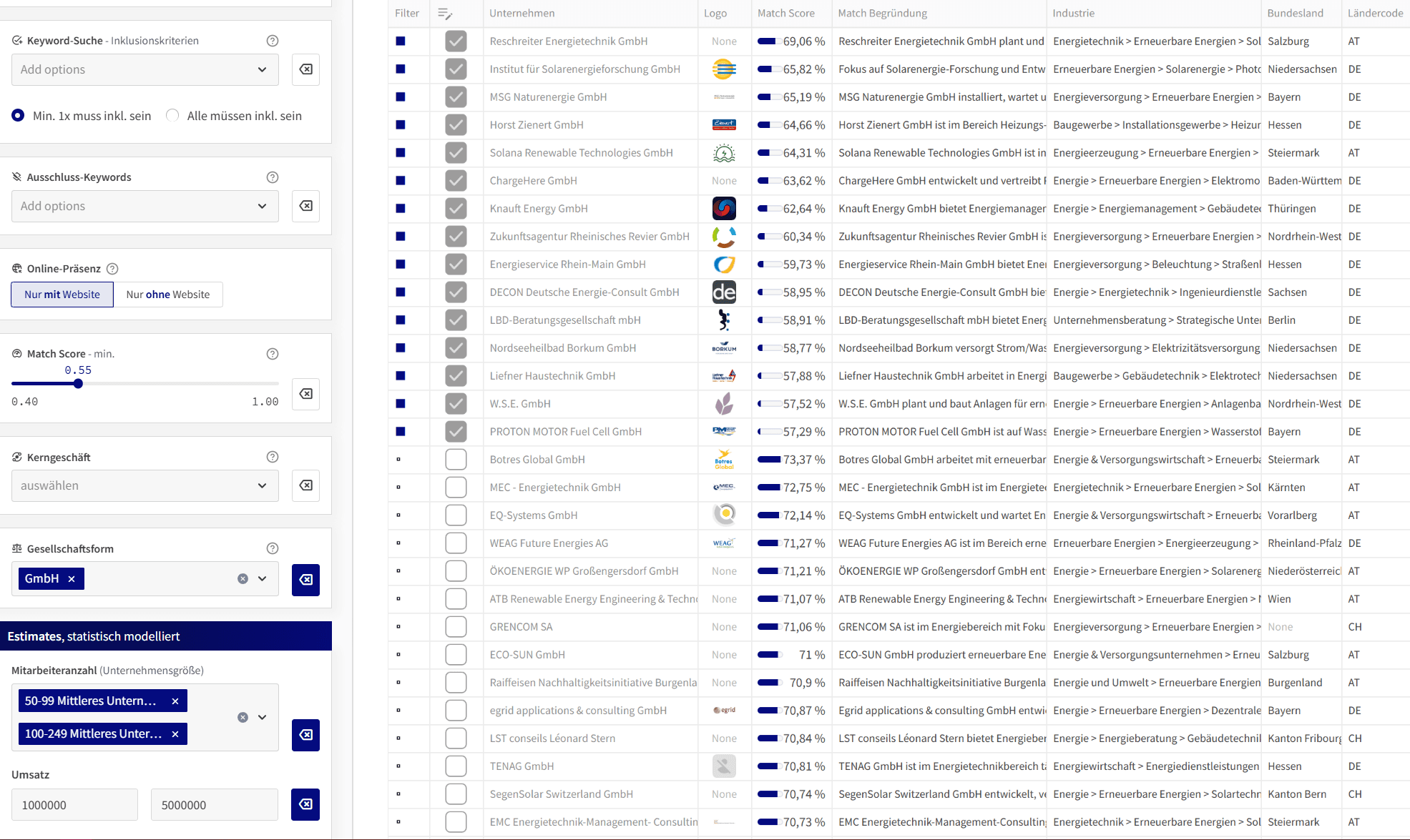 Eine vollständige semantische Suche mit angereicherten Unternehmensdaten und exportfertiger Longlist dauert in der Regel wenige Minuten, verglichen mit mehreren Arbeitstagen bei klassischer manueller Recherche.