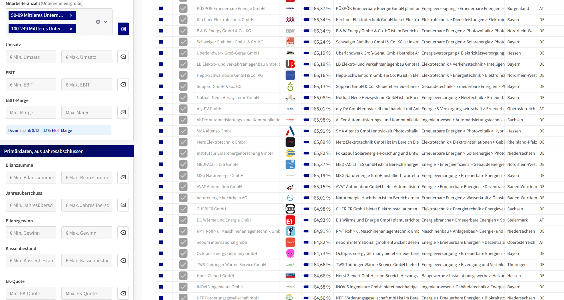 Risikosignale filtern: Der Makler filtert nach spezifischen Indikatoren, z. B. Unternehmen mit jüngsten M&A-Transaktionen, stark wachsende Betriebe oder Betriebe mit erkennbarem Nachfolgebedarf.