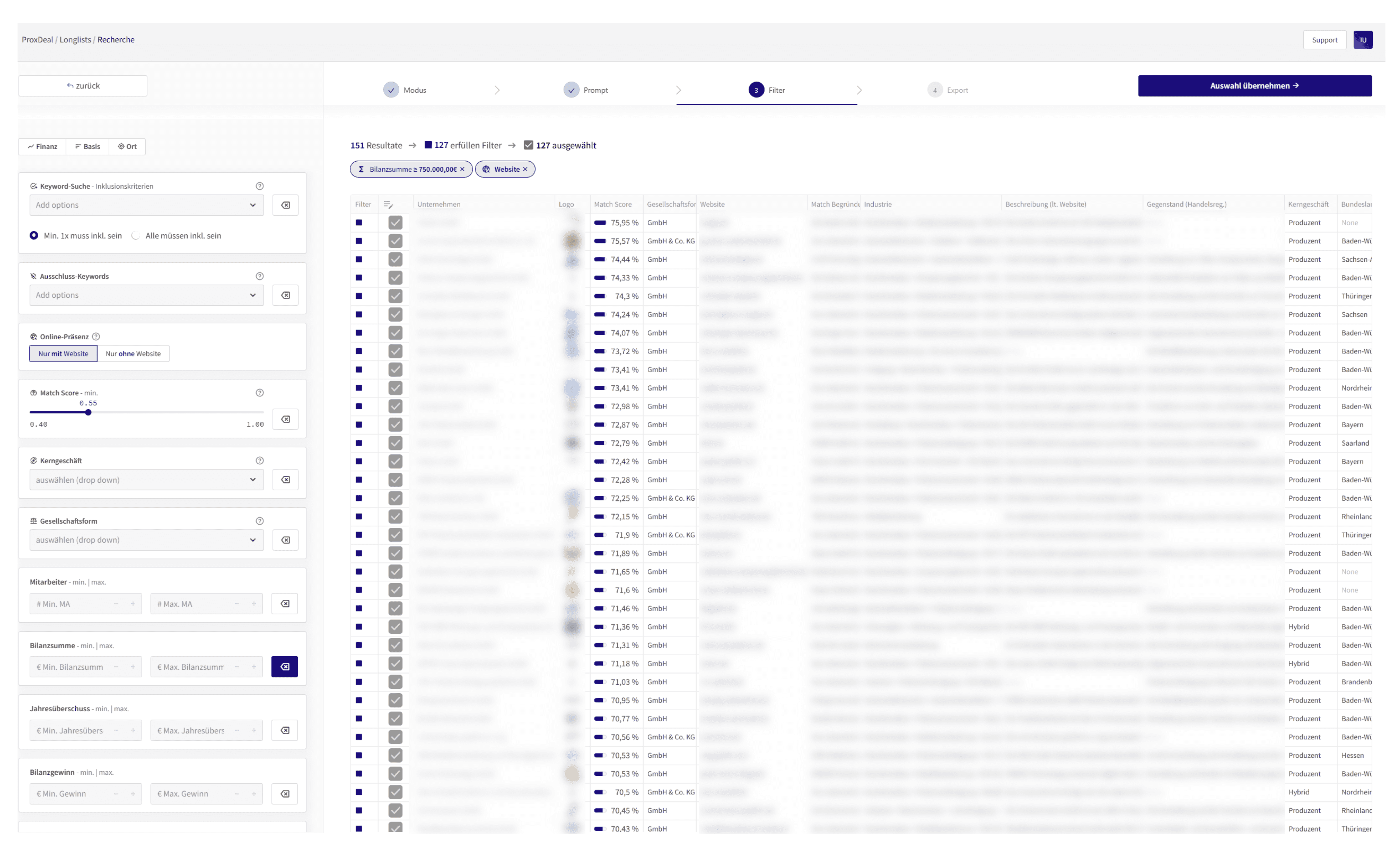 Nachdem die Longlist generiert wurde, erscheint eine erste Übersicht der passenden Unternehmen. In diesem Schritt können die Suchergebnisse direkt weiter gefiltert und präzisiert werden.